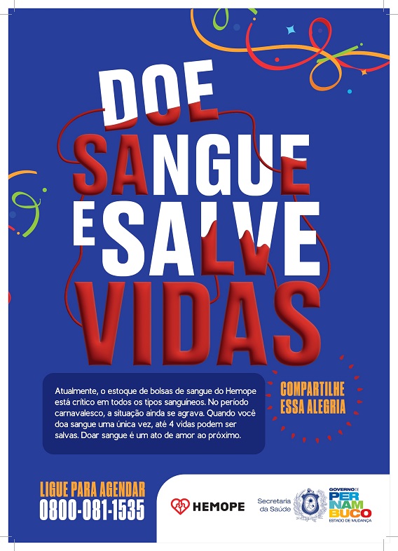 Com o objetivo de reforçar o estoque de sangue para dar suporte durante o período carnavalesco, o Hemope inicia uma grande ação de sensibilização em clima de carnaval. Personalidades da música e troças carnavalescas pernambucanas irão participar da abertura da mobilização que será no dia 09 de janeiro, no 3º andar do Paço do Frevo, às 8h30. Participarão da festa o grupo lírico O Bonde; os cantores Getúlio Cavalcanti, Nena Queiroga, Ed Carlos e Nonô Germano; a troça Pitombeira dos Quatro Cantos; a Calunguinha e Luiz Adolpho (representante social do Homem da Meia Noite); Bloco Eu Acho é Pouco; Batutas de São José; e da Orquestra Paranampuka.